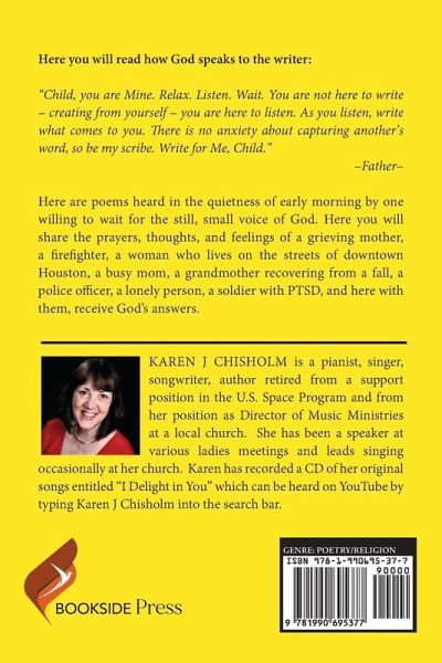 Here you will read how God speaks to the writer: "Child, you are Mine. Relax. Listen. Wait. You are not here to write - creating from yourself - you are here to listen. As you listen, write what comes to you. There is no anxiety about capturing another's word, so be my scribe. Write for Me, Child."-Father- Here are poems heard in the quietness of early morning by one willing to wait for the still, small voice of God. Here you will share the prayers, thoughts, and feelings of a grieving mother, a firefighter, a woman who lives on the streets of downtown Houston, a busy mom, a grandmother recovering from a fall, a police officer, a lonely person, a soldier with PTSD, and here with them, receive God's answers.