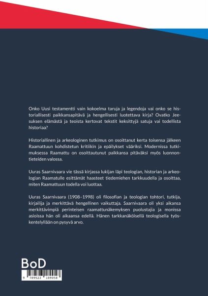 Onko Uusi testamentti vain kokoelma taruja ja legendoja vai onko se historiallisesti paikkansapitävä ja hengellisesti luotettava kirja? Ovatko Jeesuksen elämästä ja teoista kertovat tekstit keksittyjä satuja vai todellista historiaa? Historiallinen ja arkeologinen tutkimus on osoittanut kerta toisensa jälkeen Raamattuun kohdistetun kritiikin ja epäilykset vääriksi. Modernissa tutkimuksessa Raamattu on osoittautunut paikkansa pitäväksi myös luonnontieteiden valossa. Uuras Saarnivaara vie tässä kirjassa lukijan läpi teologian, historian ja arkeologian Raamatulle esittämät haasteet tiedemiehen tarkkuudella ja osoittaa, miten Raamattuun todella voi luottaa.