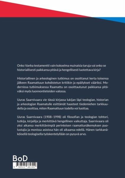 Onko Vanha testamentti vain kokoelma muinaisia taruja vai onko se historiallisesti paikkansa pitävä ja hengellisesti luotettava kirja? Raamattua koskeva historiallinen ja arkeologinen tutkimus on osoittanut kerta toisensa jälkeen siihen kohdistetun kritiikin ja epäilykset vääriksi. Modernissa tutkimuksessa Raamattu on osoittautunut paikkansa pitäväksi myös luonnontieteiden valossa. Uuras Saarnivaara vie tässä kirjassa lukijan läpi teologian, historian ja arkeologian Raamatulle esittämät haasteet tiedemiehen tarkkuudella ja osoittaa, miten Raamattuun todella voi luottaa.