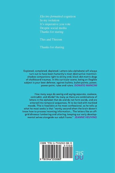 VOIR DIRE is Nico Vassilakis' seventh book of poetry. With this volume, Vassilakis continues to carry us along toward the metaphysical unmooring of language material or put otherwise, how staring at writing itself can induce a transformative experience so as to alter the very act of seeing. This collection unfolds with engaging reading text and goes straight through to the psychology of seeing text anew. The very nature of visual interpretation of language is tinkered with. This book of writing is deliberate with its drifts in form and content, but attempts to loosely resolve the unifying theory that the contents of an alphabet are of higher import than the words they create. VOIR DIRE unravels in three sections, the book travels from appropriation to the politics and investigations of seeing to a manifesto, of sorts, extolling the sovereignty of letters. The journey moves the reader from a gathering of words through to one word and into a singular letter - a focused point. Vassilakis advances us further into considering how poetry and its ingredients can be understood visually and how visual poetry can be encountered with a critical eye. Nico Vassilakis is a poet who writes and draws language that focuses on the visual jettisoning of letters from their word position. He has published books of poetry and text/art including Disparate Magnets (BlazeVOX), Alphabet Noir (c_L Books), Moments Notice (Luna Bisonte), Diesel Hand (Chax Press), Text Loses Time (ManyPenny) and Diptychs (Otolith). He co-edited The Last Vispo Anthology: Visual Poetry 1998-2008 (Fantagraphics) and was a curator of several international visual/concrete poetry exhibitions. He currently lives in Greenville, IL with his wife and animals.
