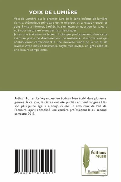 Voix de Lumière est le premier livre de la série enfants de lumière dont la thématique principale est le religieux et la relation entre les gens. Il vise à informer, à réfléchir, à remettre en question les valeurs et à nous mettre en avant des faits historiques.Je fais une invitation au lecteur à plonger profondément dans cette aventure pleine de divertissement, de mystère et d'informations qui contribueront certainement à une nouvelle vision de la vie et de l'avenir. Avec mes compliments, soyez mes invités, un gros câlin et une lecture compétente.