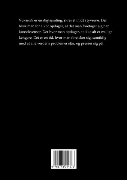 Voksen!? er en digtsamling, skrevet midt i tyverne. Der hvor man for alvor opdager, at det man foretager sig har konsekvenser. Der hvor man opdager, at ikke alt er muligt længere. Det er en tid, hvor man forelsker sig, samtidig med at alle verdens problemer står og presser sig på.