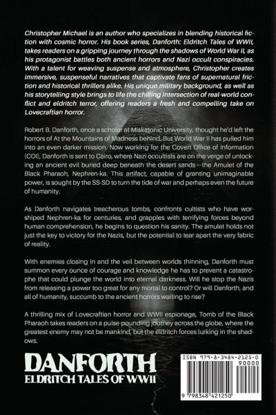 2024 Bram Stoker Awards Recommended Reading List for Superior Achievement in a First Novel. The Cthulhu Mythos continues in the series Danforth: Eldritch Tales of WWII . In this Lovecraftian tale of horror and espionage, Tomb of the Black Pharaoh follows Robert B. Danforth, a former Miskatonic University scholar still reeling from the horrific events At the Mountains of Madness. Now part of the newly formed Office of the Coordinator of Information (COI) - the predecessor of the famed Office of Strategic Services (OSS) - Danforth is dispatched to Cairo to thwart a Nazi plot to recover the Talisman of Nephren-ka, buried deep within the lost tomb of Black Pharaoh. Said to grant unspeakable power, the artifact could tip the scales of World War II in the Nazis' favor. As Danforth delves into the ancient tomb, he faces cults devoted to Nephren-ka, Nazi occultists, and cosmic horrors that strain the limits of his sanity. Danforth must battle not only the looming threat of the Nazis but also the terrifying implications of the Amulet's power. As eldritch forces close in and the boundaries between reality and madness begin to crumble, Danforth realizes the cost of failure may be far greater than even the war-humanity itself may be at stake. This heart-pounding mix of Lovecraftian horror and historical espionage will captivate fans of cosmic terror and WWII thrillers alike. It immerses readers in a world where ancient gods and modern warfare collide in a fight for ultimate power.