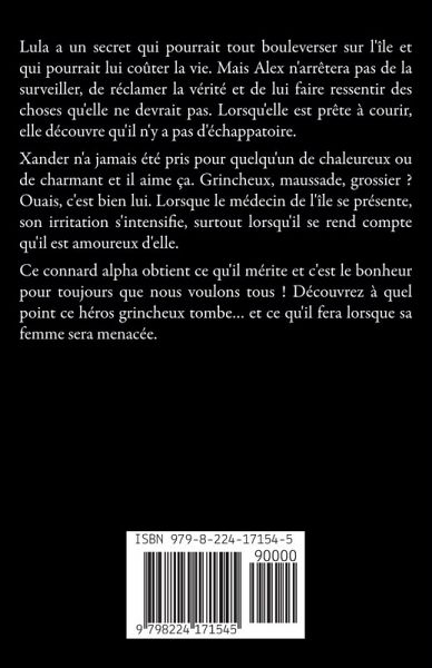 Lula a un secret qui pourrait tout bouleverser sur l'île et qui pourrait lui coûter la vie. Mais Alex n'arrêtera pas de la surveiller, de réclamer la vérité et de lui faire ressentir des choses qu'elle ne devrait pas. Lorsqu'elle est prête à courir, elle découvre qu'il n'y a pas d'échappatoire. Xander n'a jamais été pris pour quelqu'un de chaleureux ou de charmant et il aime ça. Grincheux, maussade, grossier ? Ouais, c'est bien lui. Lorsque le médecin de l'île se présente, son irritation s'intensifie, surtout lorsqu'il se rend compte qu'il est amoureux d'elle. Ce connard alpha obtient ce qu'il mérite et c'est le bonheur pour toujours que nous voulons tous ! Découvrez à quel point ce héros grincheux tombe... et ce qu'il fera lorsque sa femme sera menacée.