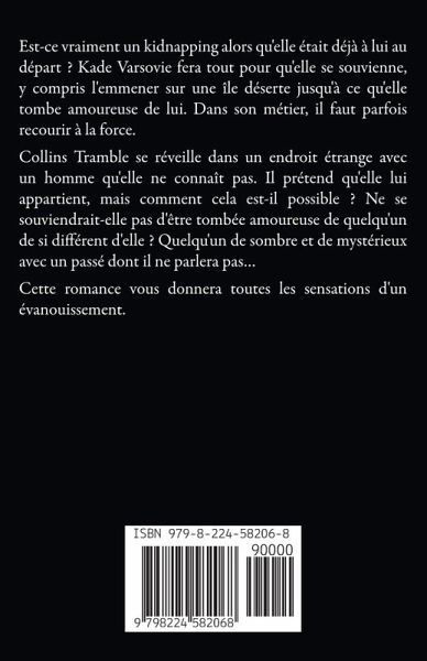 Est-ce vraiment un kidnapping alors qu'elle était déjà à lui au départ ? Kade Varsovie fera tout pour qu'elle se souvienne, y compris l'emmener sur une île déserte jusqu'à ce qu'elle tombe amoureuse de lui. Dans son métier, il faut parfois recourir à la force. Collins Tramble se réveille dans un endroit étrange avec un homme qu'elle ne connaît pas. Il prétend qu'elle lui appartient, mais comment cela est-il possible ? Ne se souviendrait-elle pas d'être tombée amoureuse de quelqu'un de si différent d'elle ? Quelqu'un de sombre et de mystérieux avec un passé dont il ne parlera pas... Cette romance vous donnera toutes les sensations d'un évanouissement.