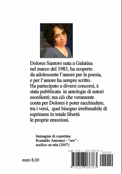 IRDA EDIZIONI Una nuova voce della poesia contemporanea italiana, quella di Santoro Dolores, una voce del nostro Sud, ricca di tutti colori mediterranei, pieni di luce. La Luce è il tema ricorrente di questa raccolta di versi. Luce che non si pone mai come contrasto al buio, anzi l'oscurità, le tenebre sembrano ammaliate dalla sua grandezza: Luce densa delle Tenebre che la cullano" - "Oscurità che Domani chiameremo Luce". L'autrice fa proprio uno dei pensieri portanti del messaggio poetico dantesco, secondo il quale la Luce è Amore e l'Amore, per Ella, permea di sé ogni cosa e ogni cosa trascende, impreziosendo ogni attimo dell'esistenza. L'Amore, da lei cantato, è delicato e appassionato al contempo e si pone, con l'umiltà semplice d'una goccia d'acqua, fino a considerarsi "piccola perla" che chiede all'amato bene d'essere custodita nell'anima, come la gemma più inestimabile. Amore che, in Lei, è vivere per l'altro e con l'altro in un viversi vicendevole, simbiotico di anime...