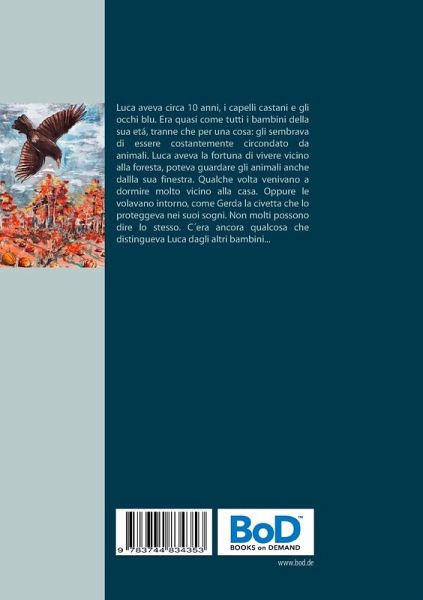 Luca aveva circa 10 anni, i capelli castani e gli occhi blu. Era quasi come tutti i bambini della sua etá, tranne che per una cosa: gli sembrava di essere costantemente circondato da animali. Luca aveva la fortuna di vivere vicino alla foresta, poteva guardare gli animali anche dallla sua finestra. Qualche volta venivano a dormire molto vicino alla casa. Oppure le volavano intorno, come Gerda la civetta che lo proteggeva nei suoi sogni. Non molti possono dire lo stesso. C¿era ancora qualcosa che distingueva Luca dagli altri bambini...