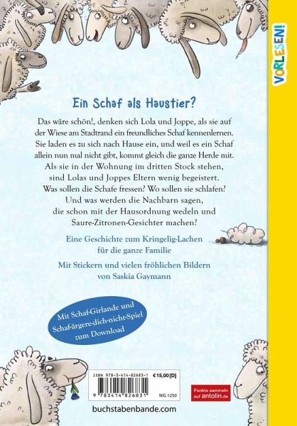 Euer Kind wünscht sich ein Haustier? Dann lest gemeinsam dieses Buch und lacht euch kringelig! Ein Schaf als Haustier? Das wäre schön!, denken sich Lola und Joppe, als sie auf der Wiese am Stadtrand ein freundliches Schaf kennenlernen. Sie laden es zu sich nach Hause ein, und weil es ein Schaf allein nun mal nicht gibt, kommt gleich die ganze Herde mit. Als sie in der Wohnung im dritten Stock stehen, sind Lolas und Joppes Eltern wenig begeistert. Was sollen die Schafe fressen? Wo sollen sie schlafen? Und was werden wohl die Nachbarn sagen, die schon mit der Hausordnung wedeln und Saure-Zitronen-Gesichter machen?Beste Unterhaltung für die ganze Familie mit tollen Extras: - Viele bunte Bilder von Saskia Gaymann, die auf jeder Seite für eine Extra-Portion Witz sorgen- Mit Schaf-Girlande und Schaf-ärgere-dich-nicht-Spiel zum Download- Mit Lesebändchen, damit man gleich weiterlesen kann- Und mit süßen Stickern, die vorne ins Buch geklebt werden können, um den Lesefortschritt sichtbar zu machen- Auch für die Schule geeignet: ein Quiz bei Antolin als Extra-Motivation für Selbstleser:innen!- Das perfekte Geschenk für Kinder ab 5 Jahren