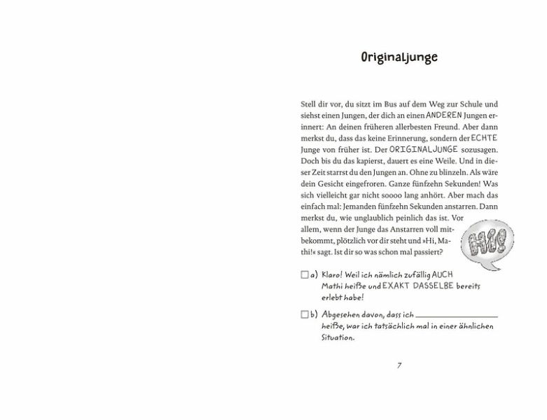Bei diesem Buch fühlt man sich, als wäre man dabei: Mathilda plaudert mit den Lesenden wie mit einer besten Freundin und stellt Fragen, die durch Ankreuzen oder Eintragen beantwortet werden können.