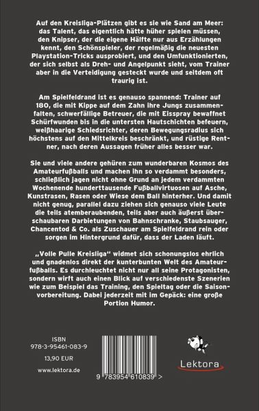 Auf den Kreisliga-Plätzen gibt es sie wie Sand am Meer: das Talent, das eigentlich hätte höher spielen müssen, den Knipser, der die eigene Hälfte nur aus Erzählungen kennt, den Schönspieler, der regelmäßig die neuesten Playstation-Tricks ausprobiert, und den Umfunktionierten, der sich selbst als Dreh- und Angelpunkt sieht, vom Trainer aber in die Verteidigung gesteckt wurde und seitdem oft traurig ist. Am Spielfeldrand ist es genauso spannend: Trainer auf 180, die mit Kippe auf dem Zahn ihre Jungs zusammenfalten, schwerfällige Betreuer, die mit Eisspray bewaffnet Schürfwunden bis in die untersten Hautschichten befeuern, weißhaarige Schiedsrichter, deren Bewegungsradius sich höchstens auf den Mittelkreis beschränkt, und rüstige Rentner, nach deren Aussagen früher alles besser war.Sie und viele andere gehören zum wunderbaren Kosmos des Amateurfußballs und machen ihn so verdammt besonders, schließlich jagen nicht ohne Grund an jedem verdammten Wochenende hunderttausende Fußballvirtuosen auf Asche, Kunstrasen, Rasen oder Wiese dem Ball hinterher. Und damit nicht genug, parallel dazu ziehen sich genauso viele Leute die teils atemberaubenden, teils aber auch äußerst überschaubaren Darbietungen von Bahnschranke, Staubsauger, Chancentod & Co. als Zuschauer am Spielfeldrand rein oder sorgen im Hintergrund dafür, dass der Laden läuft. "Volle Pulle Kreisliga" widmet sich schonungslos ehrlich und gnadenlos direkt der kunterbunten Welt des Amateurfußballs. Es durchleuchtet nicht nur all seine Protagonisten, sondern wirft auch einen Blick auf verschiedenste Szenerien wie zum Beispiel das Training, den Spieltag oder die Saisonvorbereitung. Dabei jederzeit mit im Gepäck: eine große Portion Humor.