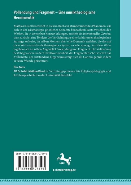 Mathias Kissel beschreibt in diesem Buch ein atemberaubendes Phänomen, das sich in der Dramaturgie geistlicher Konzerte beobachten lässt: Zwischen den Werken, die in demselben Konzert erklingen, entsteht ein intertextuelles Gewebe, dass zunächst eine Tendenz der Verdichtung zu einer kohärenten theologischen Aussage aufweist, im selben Moment aber eine Dynamik entfaltet, die das auf diese Weise entstehende theologische «System» wieder sprengt. Auf diese Weise ergeben sich im selben Augenblick Vollendung und Fragment: Die Vollendung besteht geradezu in der Unvollkommenheit; das Fragmentarische ist selbst das Vollendete; der entstandene Organismus zeigt sich als Ganzer, gerade indem er seine Wunde präsentiert.