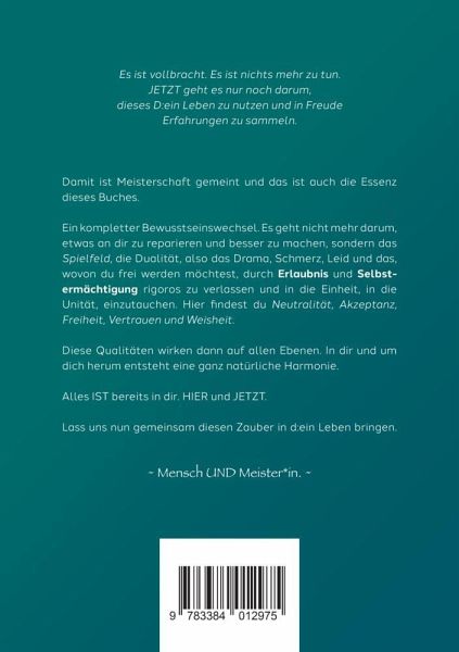 Ich nehme dich mit auf eine Reise zu dir selbst. Im Buch erfährst du all die Facetten, die dein Leben LEICHT werden lassen. Ein IN DIR-Ankommen macht sich bemerkbar. Dein Verstand wird still. Am Ende des Buches wird es STILL & RUHIG - IN DIR. Dieses Buch ist kein Ratgeber. Diese gibt es bereits wie Sand am Meer. Dieses Buch eröffnet dir neue Möglichkeiten, die Welt in dir und um dich herum NEU zu betrachten. Ohne Bewertung. Ohne zu wissen, was gut und was nicht gut ist. Du spürst Neutralität. Das macht dir möglich zu beginnen, ALLES zu genießen, abgesehen davon, was sich gerade zeigt. Hier entdeckst du die Leichtigkeit, die schon immer da war, die du nur unter all den Schleiern der Vergangenheit, der Hoffnungen und Wünsche nicht gespürt hast.Dein Leben wird jetzt einen neuen Sinn bekommen.Herzlichen Glückwunsch und viel Freude beim Lesen!