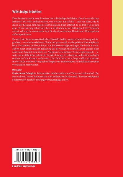Du wirst hier keine unverständlichen Floskeln finden, sondern Unterstützung auf Augenhöhe - von einem erfahrenen Tutor, der genau weiß, wo die größten Schwierigkeiten beim Verständnis und beim Lösen von Induktionsaufgaben liegen. Und nicht nur das: Neben einer anschaulichen Erklärung des Beweisschemas findest du in diesem Buch zahlreiche Beispiele und über 100 Aufgaben verschiedener Schwierigkeitsgrade - jeweils mit ausführlicher Schritt-für-Schritt-Lösung. So bekommst du Routine und wirst optimal auf die Klausur vorbereitet. Und falls doch noch Fragen offen sein sollten: In den FAQs werden die typischen Fragen von Studierenden zu Induktionsbeweisen verständlich beantwortet.