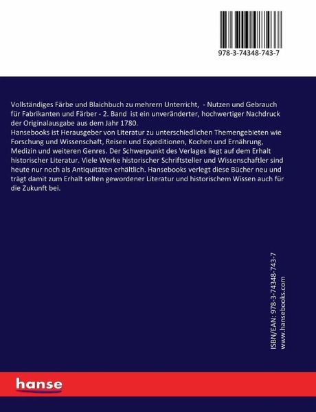 Vollständiges Färbe und Blaichbuch zu mehrern Unterricht, - Nutzen und Gebrauch für Fabrikanten und Färber - 2. Band ist ein unveränderter, hochwertiger Nachdruck der Originalausgabe aus dem Jahr 1780.