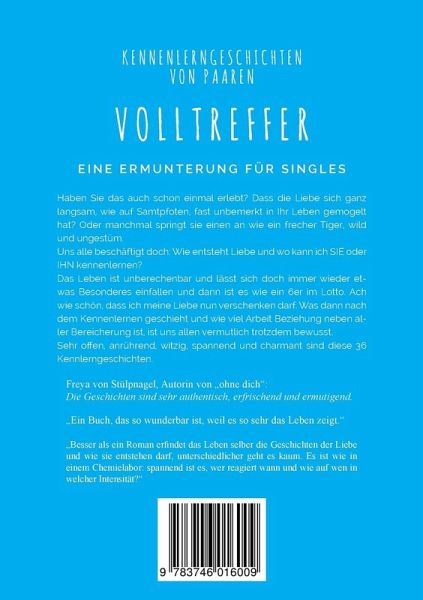 Haben Sie das auch schon einmal erlebt? Dass die Liebe sich ganz langsam, wie auf Samtpfoten, fast unbemerkt in Ihr Leben gemogelt hat? Oder manchmal springt sie einen an wie ein frecher Tiger, wild und ungestüm.Uns alle beschäftigt doch: Wie entsteht Liebe und wo kann ich SIE oder IHN kennenlernen?Das Leben ist unberechenbar und lässt sich doch immer wieder etwas Besonderes einfallen und dann ist es wie ein 6er im Lotto. Ach wie schön, dass ich meine Liebe nun verschenken darf. Was dann nach dem Kennenlernen geschieht und wie viel Arbeit Beziehung neben aller Bereicherung ist, ist uns allen vermutlich trotzdem bewusst.Sehr offen, anrührend, witzig, spannend und charmant sind diese 36 Kennlerngeschichten. Freya von Stülpnagel, Autorin von ohne dich: Die Geschichten sind sehr authentisch, erfrischend und ermutigend.Ein Buch, das so wunderbar ist, weil es so sehr das Leben zeigt.Besser als ein Roman erfindet das Leben selber die Geschichten der Liebe und wie sie entstehen darf, unterschiedlicher geht es kaum. Es ist wie in einem Chemielabor: spannend ist es, wer reagiert wann und wie auf wen in welcher Intensität?