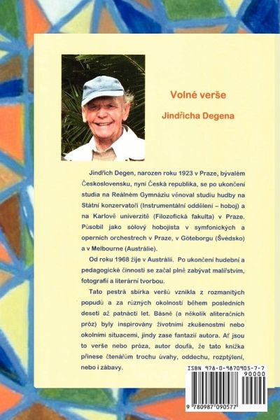 Volne verse (Free Verse) is a diverse collection of Czech poems composed by Jindrich (Henry) Degen (born in 1923 in Prague), who immigrated to Australia in 1968. After a successful career as a musician (oboist) in symphony and opera orchestras, Jindrich has devoted himself to art, photography, and poetry. The 61 poems and three alliteration prose pieces are arranged under eight categories. The themes in Volne verse include the world around us, science and technology, nature, health, as well as wit and humour. The creations were inspired by observing and contemplations on life and / or world conditions, personal experiences, dreams, or simply fantasy. Some capture recent events, others harken back to a more distant past. With the author's age and having left his home country over 50 years ago, some of the expressions may appear to younger readers a little archaic. The thoughts however, are fresh and very relevant to our time -- maybe even more so than the day they were written some 15 or more years ago. Readers comment that they find the poems profound, thought-provoking, and entertaining.