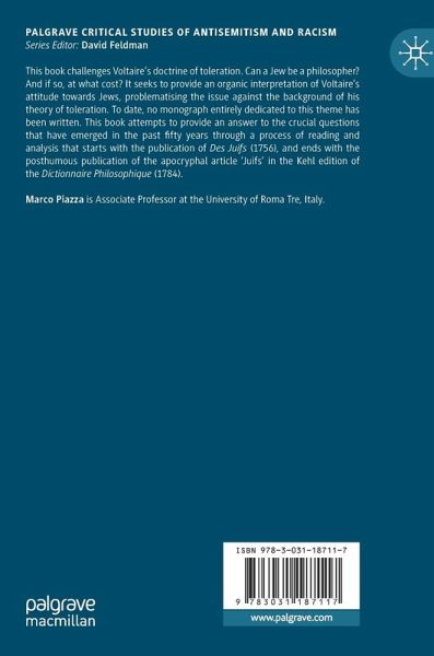 This book challenges Voltaire's doctrine of toleration. Can a Jew be a philosopher? And if so, at what cost? It seeks to provide an organic interpretation of Voltaire's attitude towards Jews, problematising the issue against the background of his theory of toleration. To date, no monograph entirely dedicated to this theme has been written. This book attempts to provide an answer to the crucial questions that have emerged in the past fifty years through a process of reading and analysis that starts with the publication of Des Juifs (1756), and ends with the posthumous publication of the apocryphal article 'Juifs' in the Kehl edition of the Dictionnaire Philosophique (1784).