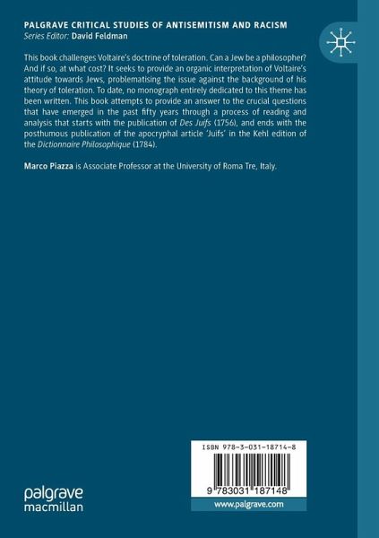 This book challenges Voltaire's doctrine of toleration. Can a Jew be a philosopher? And if so, at what cost? It seeks to provide an organic interpretation of Voltaire's attitude towards Jews, problematising the issue against the background of his theory of toleration. To date, no monograph entirely dedicated to this theme has been written. This book attempts to provide an answer to the crucial questions that have emerged in the past fifty years through a process of reading and analysis that starts with the publication of Des Juifs (1756), and ends with the posthumous publication of the apocryphal article 'Juifs' in the Kehl edition of the Dictionnaire Philosophique (1784).