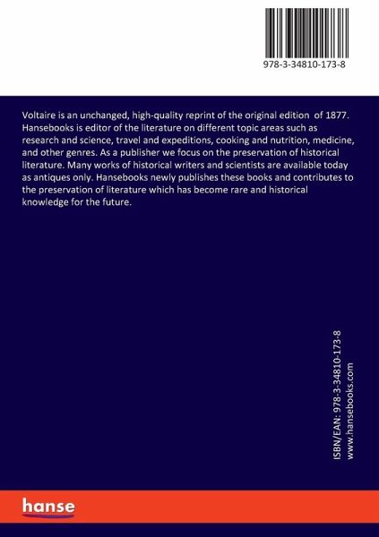 Voltaire is an unchanged, high-quality reprint of the original edition of 1877.Hansebooks is editor of the literature on different topic areas such as research and science, travel and expeditions, cooking and nutrition, medicine, and other genres. As a publisher we focus on the preservation of historical literature. Many works of historical writers and scientists are available today as antiques only. Hansebooks newly publishes these books and contributes to the preservation of literature which has become rare and historical knowledge for the future.