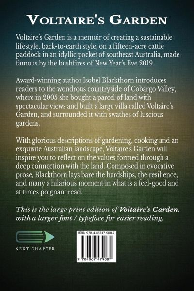 Voltaire's Garden is a memoir of creating a sustainable lifestyle, back-to-earth style, on a fifteen-acre cattle paddock in an idyllic pocket of southeast Australia, made famous by the bushfires of New Year's Eve 2019. Award-winning author Isobel Blackthorn introduces readers to the wondrous countryside of Cobargo Valley, where in 2005 she bought a parcel of land with spectacular views and built a large villa called Voltaire's Garden, and surrounded it with swathes of luscious gardens. With glorious descriptions of gardening, cooking and an exquisite Australian landscape, Voltaire's Garden will inspire you to reflect on the values formed through a deep connection with the land. Composed in evocative prose, Blackthorn lays bare the hardships, the resilience, and many a hilarious moment in what is a feel-good and at times poignant read. This is the large print edition of Voltaire's Garden, with a larger font / typeface for easier reading.