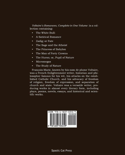 Voltaire's Romances, Complete in One Volume is a collection containing: The White Bull: A Satirical Romance, Zadig; or Fate, The Sage and the Atheist, The Princess of Babylon, The Man of Forty Crowns, The Huron; or, Pupil of Nature, Micromegas, The Study of Nature. François-Marie, known by his nom de plume Voltaire, was a French Enlightenment writer, historian and philosopher famous for his wit, his attacks on the established Catholic Church, and his advocacy of freedom of religion, freedom of expression, and separation of church and state. Voltaire was a versatile writer, producing works in almost every literary form, including plays, poems, novels, essays, and historical and scientific works.