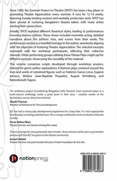 Since 1988, the Summer Project on Theatre (SPOT) has been a key player in promoting Theatre Appreciation every summer. It runs for 12-14 weeks, featuring Sunday training sessions and weekday production work. SPOT has been pivotal in nurturing Bangalore's theatre talent, with many artists starting their careers here. Initially, SPOT explored different theatrical styles, leading to performances honoring famous authors. These shows included ensemble acting, detailed narrations about the authors' lives, and scenes from their works. The performance served as a heartfelt homage to the author, seamlessly aligning with the objective of fostering Theatre Appreciation. The selected excerpts resonated with the workshop participants, reflecting their collective interests. Other performing groups utilizing these Tribute Plays might opt for different excerpts, showcasing the versatility of the material. This volume comprises scripts developed through workshop sessions, tailored for genre-author explorations. It features plays centered around the lives and works of esteemed figures such as Federico Garcia Lorca, Eugene lonesco, Molière (Jean-Baptiste Poquelin), August Strindberg, and Rabindranath Tagore.