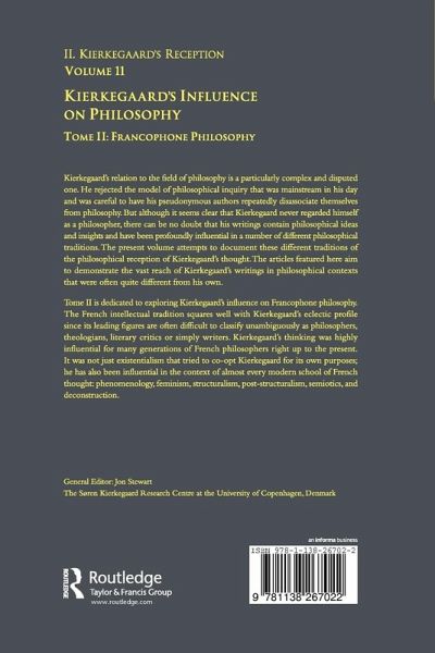 Tome II is dedicated to exploring Kierkegaard's influence on Francophone philosophy. The French intellectual tradition squares well with Kierkegaard's eclectic profile since its leading figures are often difficult to classify unambiguously as philosophers, theologians, literary critics or simply writers. Kierkegaard's thinking has been highly influential for many generations of French philosophers up to the present. It was not just existentialism that tried to co-opt Kierkegaard for its own purposes; he has also been influential in the context of almost every modern school of French thought: phenomenology, feminism, structuralism, post-structuralism, semiotics and deconstruction.