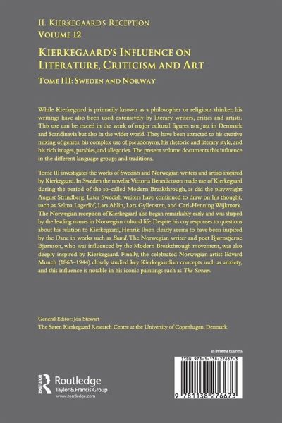 Tome III investigates the works of Swedish and Norwegian writers and artists inspired by Kierkegaard. In Sweden the novelist Victoria Benedictsson made use of Kierkegaard during the period of the so-called Modern Breakthrough, as did the playwright August Strindberg. Later Swedish writers have continued to draw on his thought, such as Selma Lagerlof, Lars Ahlin, Lars Gyllensten, and Carl-Henning Wijkmark. The Norwegian reception of Kierkegaard also began remarkably early and was shaped by the leading names in Norwegian cultural life. Despite his coy responses to questions about his relation to Kierkegaard, Henrik Ibsen clearly seems to have been inspired by the Dane in works such as Brand. Norwegian writer and poet Bjornstjerne Bjornson, who was influenced by the Modern Breakthrough movement, was also deeply inspired by Kierkegaard. Finally, the celebrated Norwegian artist Edvard Munch (1863-1944) closely studied key Kierkegaardian concepts such as anxiety, and his influence is notable in his iconic paintings such as The Scream.