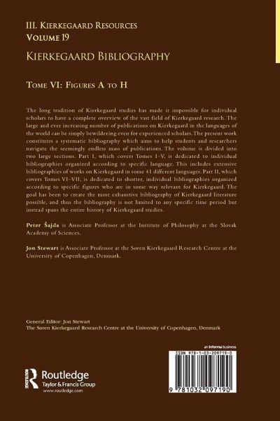 The long tradition of Kierkegaard studies has made it impossible for individual scholars to have a complete overview of the vast field of Kierkegaard research. The large and ever increasing number of publications on Kierkegaard in the languages of the world can be simply bewildering even for experienced scholars. The present work constitutes a systematic bibliography which aims to help students and researchers navigate the seemingly endless mass of publications. The volume is divided into two large sections. Part I, which covers Tomes I-V, is dedicated to individual bibliographies organized according to specific language. This includes extensive bibliographies of works on Kierkegaard in some 41 different languages. Part II, which covers Tomes VI-VII, is dedicated to shorter, individual bibliographies organized according to specific figures who are in some way relevant for Kierkegaard. The goal has been to create the most exhaustive bibliography of Kierkegaard literature possible, and thus the bibliography is not limited to any specific time period but instead spans the entire history of Kierkegaard studies.