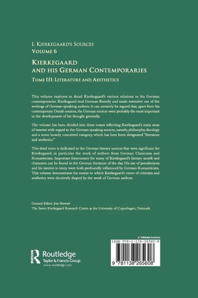 This third tome is dedicated to the German literary sources that were significant for Kierkegaard; in particular the work of authors from German Classicism and Romanticism. Important forerunners for many of Kierkegaard's literary motifs and characters can be found in the German literature of the day. His use of pseudonyms and his interest in irony were both profoundly influenced by German Romanticism. This volume demonstrates the extent to which Kierkegaard's views of criticism and aesthetics were decisively shaped by the work of German authors.
