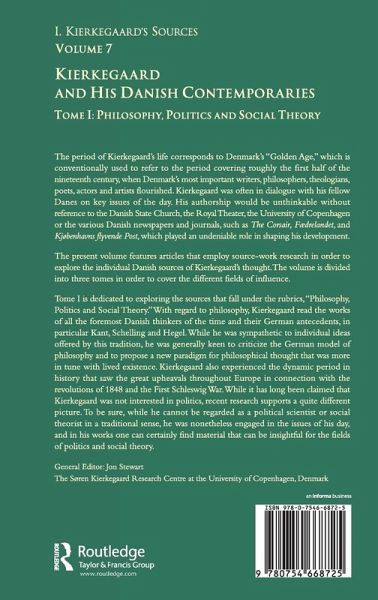 The period of Kierkegaard's life corresponds to Denmark's "Golden Age," which is conventionally used to refer to the period covering roughly the first half of the nineteenth century, when Denmark's most important writers, philosophers, theologians, poets, actors and artists flourished. Kierkegaard was often in dialogue with his fellow Danes on key issues of the day. His authorship would be unthinkable without reference to the Danish State Church, the Royal Theater, the University of Copenhagen or the various Danish newspapers and journals, such as The Corsair, Fÿdrelandet, and Kjÿbenhavns flyvende Post, which played an undeniable role in shaping his development. The present volume features articles that employ source-work research in order to explore the individual Danish sources of Kierkegaard's thought. The volume is divided into three tomes in order to cover the different fields of influence. Tome I is dedicated to exploring the sources that fall under the rubrics, "Philosophy, Politics and Social Theory." With regard to philosophy, Kierkegaard read the works of all the foremost Danish thinkers of the time and their German antecedents, in particular Kant, Schilling and Hegel. While he was sympathetic to individual ideas offered by this tradition, he was generally keen to criticize the German model of philosophy and to propose a new paradigm for philosophical thought that was more in tune with lived existence. Kierkegaard also experienced the dynamic period in history that saw the great upheavals throughout Europe in connection with the revolutions of 1848 and the First Schleswig War. While it has long been claimed that Kierkegaard was not interested in politics, recent research supports a quite different picture. To be sure, he cannot be regarded as a political scientist or social theorist in a traditional sense, but he was nonetheless engaged in the issues of his day, and in his works one can certainly find material that can be insightful for the fields of politics and social theory.