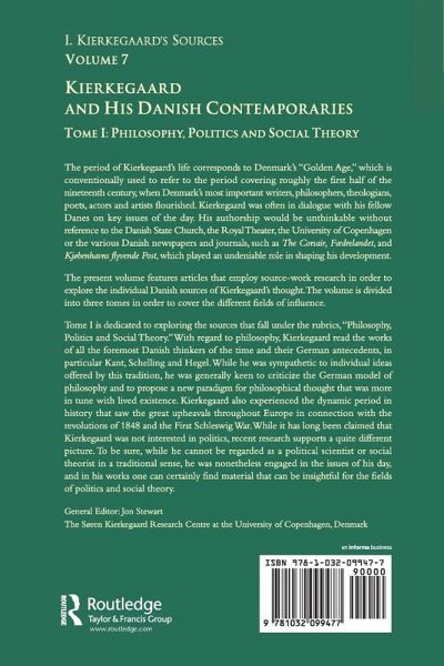 The period of Kierkegaard's life corresponds to Denmark's "Golden Age," which is conventionally used to refer to the period covering roughly the first half of the nineteenth century, when Denmark's most important writers, philosophers, theologians, poets, actors and artists flourished. Kierkegaard was often in dialogue with his fellow Danes on key issues of the day. His authorship would be unthinkable without reference to the Danish State Church, the Royal Theater, the University of Copenhagen or the various Danish newspapers and journals, such as The Corsair, Fÿdrelandet, and Kjÿbenhavns flyvende Post, which played an undeniable role in shaping his development. The present volume features articles that employ source-work research in order to explore the individual Danish sources of Kierkegaard's thought. The volume is divided into three tomes in order to cover the different fields of influence. Tome I is dedicated to exploring the sources that fall under the rubrics, "Philosophy, Politics and Social Theory." With regard to philosophy, Kierkegaard read the works of all the foremost Danish thinkers of the time and their German antecedents, in particular Kant, Schilling and Hegel. While he was sympathetic to individual ideas offered by this tradition, he was generally keen to criticize the German model of philosophy and to propose a new paradigm for philosophical thought that was more in tune with lived existence. Kierkegaard also experienced the dynamic period in history that saw the great upheavals throughout Europe in connection with the revolutions of 1848 and the First Schleswig War. While it has long been claimed that Kierkegaard was not interested in politics, recent research supports a quite different picture. To be sure, he cannot be regarded as a political scientist or social theorist in a traditional sense, but he was nonetheless engaged in the issues of his day, and in his works one can certainly find material that can be insightful for the fields of politics and social theory.