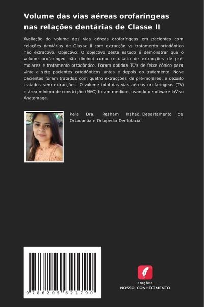 Avaliação do volume das vias aéreas orofaríngeas em pacientes com relações dentárias de Classe II com extracção vs tratamento ortodôntico não extractivo. Objectivo: O objectivo deste estudo é demonstrar que o volume orofaríngeo não diminui como resultado de extracções de pré-molares e tratamento ortodôntico. Foram obtidas TC's de feixe cônico para vinte e sete pacientes ortodônticos antes e depois do tratamento. Nove pacientes foram tratados com quatro extracções de pré-molares, e dezoito tratados sem extracções. O volume total das vias aéreas orofaríngeas (TV) e área mínima de constrição (MAC) foram medidos usando o software InVivo Anatomage.