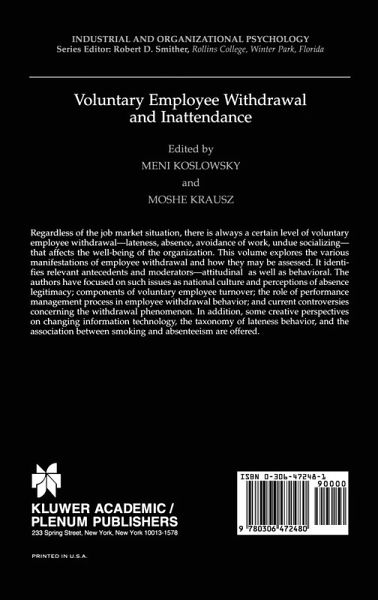 Regardless of the job market situation, there is always a certain level of voluntary employee withdrawal - lateness, absence, avoidance of work, undue socializing - that affects the well being of the organization. This volume explores the various manifestations of employee withdrawal, how they may be assessed, and identifies relevant antecedents and moderators, attitudinal as well as behavioral. The authors have focused on issues such as national culture and perceptions of absence legitimacy, components of voluntary employee turnover, the role of performance management process in employee withdrawal behavior, and current controversies concerning the withdrawal phenomenon. In addition, some creative perspectives on changing information technology, the taxonomy of lateness behavior, and the association between smoking and absenteeism are offered.