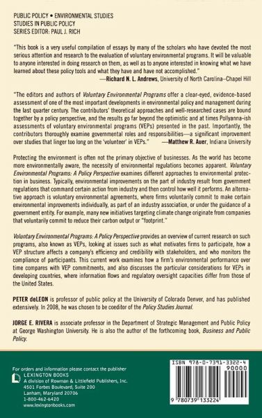 Chapter 1. Voluntary Environmental Programs: An Introduction Chapter 2. The Effectiveness of Voluntary Environmental Programs-A Policy at a Crossroads? Chapter 3. Environmental Public Voluntary Programs Reconsidered Chapter 4. Voluntary Environmental Management: Motivations and Policy Implications Chapter 5. Collective Action Through Voluntary Environmental Programs: A Club Theory Approach Chapter 6. The Diffusion Voluntary International Standards: Responsible Care, ISO 9000 and ISO 14001 in the Chemical Industry Chapter 7. Is Greener Whiter Yet? The Sustainable Slopes Program After Five Years Chapter 8. Assessing the Performance of Voluntary Environmental Programs: Does Certification Matter? Chapter 9. Can Voluntary Environmental Regulation Work in Developing Countries: Lessons from Case Studies Chapter 10. Voluntary Environmental Programs: A Canadian Perspective Chapter 11. Concluding Opinion, Voluntary Environmental Programs: Are Carrots Without Sticks Enough for Effective EnvironmentalProtection Policy?