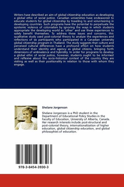 Writers have described an aim of global citizenship education as developing a global ethic of social justice. Canadian universities have endeavored to educate students for global citizenship by traveling to and volunteering in developing countries. Such programs have the potential to perpetuate the epistemic violence of colonialism by ignoring the ways in which students appropriate the developing world as other and use these experiences to solely benefit themselves. To address these issues and concerns, this qualitative study used post-colonial theory to analyze the experiences and reflections of six participants who participated in a Canadian university global citizenship program in Thailand. The study suggests that culture and perceived cultural differences have a profound effect on how students understand their identity and agency as global citizens, bringing forth dimensions of ambivalence and hybridity. In order for programs to develop a global ethic of social justice, however, students ought to be informed and reflexive about the socio-historical context of the country they are visiting as well as their positionality in relation to those with whom they engage.