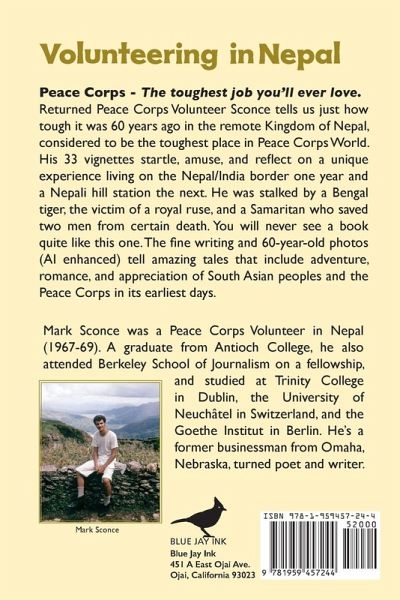 Return Peace Corps Volunteer Sconce tells us just how tough it was 60 years ago in the remote Kingdom of Nepal, considered to be the toughest place in Peace Corps World. His 32 vignettes startle, amuse, and reflect on a unique experience living on the Nepal/India border one year and a Nepali hill station the next. He was stalked by a Bengal tiger, the victim of a royal ruse, and a Samaritan who saved two men from certain death. You will never see a book quite like this one. The fine writing and 60-year-old photos (AI enhanced) tell amazing tales that include adventure, romance, and appreciation of South Asian peoples and the Peace Corps in its earliest days.