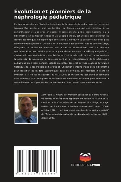 Ce livre se penche sur l'évolution historique de la néphrologie pédiatrique, en remontant jusqu'au XVe siècle, et met en lumière les figures clés qui ont contribué à sa compréhension et à sa prise en charge. Il passe ensuite à l'ère contemporaine, où la bibliométrie, en particulier l'indice H via Google Scholar, est utilisée pour identifier les leaders académiques en néphrologie pédiatrique clinique, en se concentrant sur les pays en voie de développement. L'étude a mis en évidence des personnalités de différents pays, soulignant la répartition mondiale des prouesses académiques dans ce domaine spécialisé. Alors que certains pays se targuent d'avoir un impact académique significatif, d'autres affichent des indices H plus faibles ou n'ont pas de profil du tout, ce qui souligne la nécessité de poursuivre le développement et la reconnaissance de la néphrologie pédiatrique au niveau mondial. L'étude présentée dans cet ouvrage souligne l'évolution historique de la néphrologie pédiatrique et l'utilisation contemporaine de la bibliométrie pour identifier les leaders académiques dans ce domaine. Les résultats mettent en évidence à la fois les réalisations et les lacunes en matière de leadership académique dans différents pays, soulignant la nécessité de poursuivre les efforts pour améliorer la compréhension et la gestion des troubles rénaux chez l'enfant dans le monde entier.