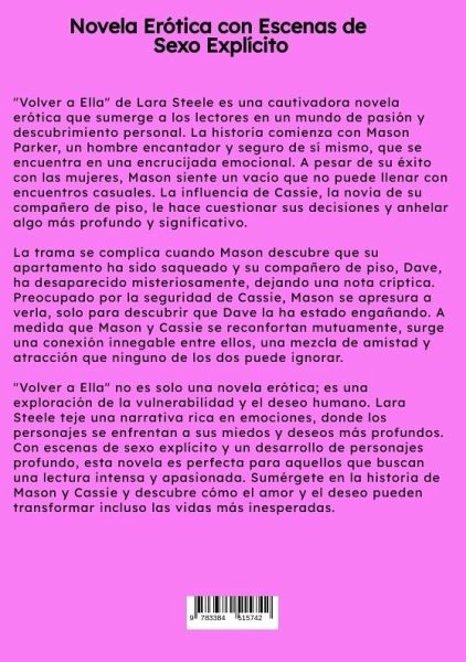 "Volver a Ella" de Lara Steele es una cautivadora novela erótica que sumerge a los lectores en un mundo de pasión y descubrimiento personal. La historia comienza con Mason Parker, un hombre encantador y seguro de sí mismo, que se encuentra en una encrucijada emocional. A pesar de su éxito con las mujeres, Mason siente un vacío que no puede llenar con encuentros casuales. La influencia de Cassie, la novia de su compañero de piso, le hace cuestionar sus decisiones y anhelar algo más profundo y significativo.La trama se complica cuando Mason descubre que su apartamento ha sido saqueado y su compañero de piso, Dave, ha desaparecido misteriosamente, dejando una nota críptica. Preocupado por la seguridad de Cassie, Mason se apresura a verla, solo para descubrir que Dave la ha estado engañando. A medida que Mason y Cassie se reconfortan mutuamente, surge una conexión innegable entre ellos, una mezcla de amistad y atracción que ninguno de los dos puede ignorar."Volver a Ella" no es solo una novela erótica; es una exploración de la vulnerabilidad y el deseo humano. Lara Steele teje una narrativa rica en emociones, donde los personajes se enfrentan a sus miedos y deseos más profundos. Con escenas de sexo explícito y un desarrollo de personajes profundo, esta novela es perfecta para aquellos que buscan una lectura intensa y apasionada. Sumérgete en la historia de Mason y Cassie y descubre cómo el amor y el deseo pueden transformar incluso las vidas más inesperadas.