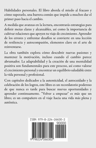 Habilidades personales. El libro aborda el miedo al fracaso y cómo superarlo, una barrera común que impide a muchos dar el primer paso hacia el cambio. A medida que avanzas en la lectura, encontrarás estrategias para definir metas claras y alcanzables, así como la importancia de cultivar relaciones que apoyen tu viaje de crecimiento. Aprender de los errores y enfrentar desafíos se convierte en una lección de resiliencia y autocompasión, elementos clave en el arte de reinventarse. La obra también explora cómo descubrir nuevas pasiones y mantener la motivación, incluso cuando el cambio parece abrumador. La adaptabilidad y la creación de una mentalidad positiva son fundamentales para este proceso, así como valorar el crecimiento personal y encontrar un equilibrio saludable entre la vida personal y profesional. Con capítulos dedicados a la autenticidad, el autocuidado y la celebración de los logros, este libro es un recordatorio poderoso de que nunca es tarde para buscar nuevas oportunidades y aprender continuamente. "Volver a empezar" es más que un libro; es un compañero en el viaje hacia una vida más plena y auténtica.