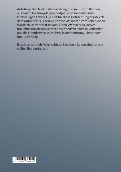 Autobiografische Kurzbetrachtungen in mehreren Bänden, aus einem bis zum jetzigen Zeitpunkt spannendem und kurzweiligen Leben. Die Zeit für diese Betrachtung ergab sich dem Autor erst, als er im Alter von 49 Jahren vom Leben einen Warnschuss verpasst bekam. Einen Warnschuss, den es brauchte, um diesen Schritt des Lebenswandels zu vollziehen und die Handbremse zu ziehen, in der Hoffnung, sie ist noch funktionsfähig. Es gab schon viele Warnschüsse in seinem Leben, doch dieser sollte alles verändern.