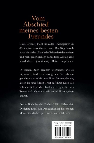 Ein (Herzens-) Pferd bis in den Tod begleiten zu dürfen, ist etwas Wunderbares. Der Weg danach noch viel mehr. Nicht jeder Reiter darf das erleben und nicht jeder Mensch kann diese Zeit als eine wunderbare (emotionale) Reise empfinden. In diesem Buch erzählen Menschen, wie es ist, wenn Pferde von uns gehen. Sie nehmen gemeinsam Abschied von ihren Sternenpferden, lassen los und finden Trost auf ihrer Reise. Sie nehmen dich an die Hand und zeigen dir, was Trauer wirklich ist und wie du mit ihr umgehen kannst. Dieses Buch ist ein Nachruf. Ein Liebesbrief. Die letzte Ehre. Ein Dankeschön an die schönen Momente. Macht's gut, ihr treuen Gefährten.