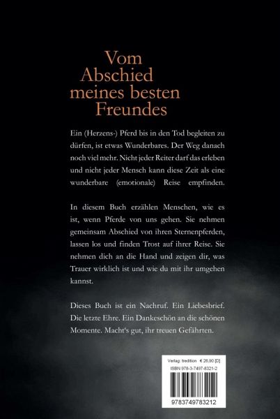Ein (Herzens-) Pferd bis in den Tod begleiten zu dürfen, ist etwas Wunderbares. Der Weg danach noch viel mehr. Nicht jeder Reiter darf das erleben und nicht jeder Mensch kann diese Zeit als eine wunderbare (emotionale) Reise empfinden. In diesem Buch erzählen Menschen, wie es ist, wenn Pferde von uns gehen. Sie nehmen gemeinsam Abschied von ihren Sternenpferden, lassen los und finden Trost auf ihrer Reise. Sie nehmen dich an die Hand und zeigen dir, was Trauer wirklich ist und wie du mit ihr umgehen kannst. Dieses Buch ist ein Nachruf. Ein Liebesbrief. Die letzte Ehre. Ein Dankeschön an die schönen Momente. Macht's gut, ihr treuen Gefährten.