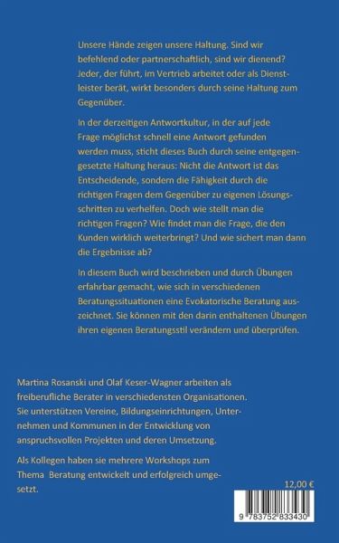 Unsere Hände zeigen unsere Haltung. Sind wir befehlend oder partnerschaftlich, sind wir dienend? Jeder der führt, im Vertrieb arbeitet oder als Dienstleister berät, wirkt besonders durch seine Haltung zum Gegenüber.In der derzeitigen Antwortkultur, in der auf jede Frage möglichst schnell eine Antwort gefunden werden muss, sticht dieses Buch durch seine entgegengesetzte Haltung heraus: Nicht die Antwort ist das Entscheidende, sondern die Fähigkeit, durch die richtigen Fragen dem Gegenüber zu eigenen Lösungsschritten zu verhelfen. Doch wie stellt man die richtigen Fragen? Wie findet man die Frage, die den Kunden wirklich weiterbringt? Und wie sichert man dann die Ergebnisse ab?In diesem Buch wird beschrieben und durch Übungen erfahrbar gemacht, wie sich in verschiedenen Beratungssituationen eine Evokatorische Beratung auszeichnet. Sie können mit den Übungen ihren eigenen Beratungsstil verändern und überprüfen.