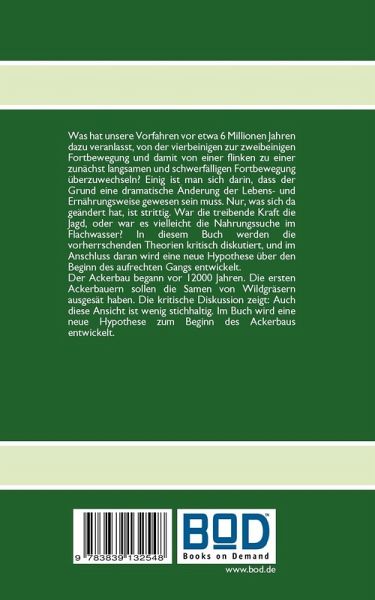 Was hat unsere Vorfahren vor etwa 6 Millionen Jahren dazu veranlasst, von der vierbeinigen zur zweibeinigen Fortbewegung und damit von einer flinken zu einer zunächst langsamen und schwerfälligen Fortbewegung überzuwechseln? Einig ist man sich darin, dass der Grund eine dramatische Änderung der Lebens- und Ernährungsweise gewesen sein muss. Nur, was sich da geändert hat, ist strittig. War die treibende Kraft die Jagd, oder war es vielleicht die Nahrungssuche im Flachwasser? In diesem Buch werden die vorherrschenden Theorien kritisch diskutiert, und im Anschluss daran wird eine neue Hypothese über den Beginn des aufrechten Gangs entwickelt.Der Ackerbau begann vor 12000 Jahren. Die ersten Ackerbauern sollen die Samen von Wildgräsern ausgesät haben. Die kritische Diskussion zeigt: Auch diese Ansicht ist wenig stichhaltig. Im Buch wird eine neue Hypothese zum Beginn des Ackerbaus entwickelt.