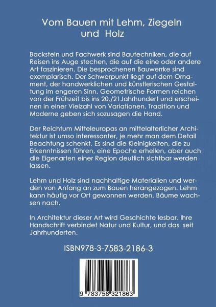 Vom Bauen mit Lehm, Ziegeln und HolzDie Handschrift der ArchitekturEs handelt sich um eine Einführung in Bautechniken, die auf Reisen ins Auge stechen, Backstein und Fachwerk, die auf die eine oder andere Art faszinieren. Die besprochenen Bauwerke sind exemplarisch, eine Vollständugkeit wird nicht angestrebt, würde auch den Rahmen sprengen. Der Schwerpunkt liegt auf dem Ornament, der künstlerischen Gestaltung im engeren Sinn, der Handschrift der Architektur.Geometrische Formen reichen von der Frühzeit bis ins 20./21. Jahrhundert und erscheinen in einer Viellzahl von Variationen. Tradition und Moderne geben sich sozusagen die Hand.Der Reichtum Mitteleuropas an mittelalterlicher Architektur ist umso interessanter, je mehr man dem Detail Beachtung schenkt. Es sind die Kleinigkeiten, die zu Erkenntnissen führen, eine Epoche erhellen, aber auch die Eigenarten einer Region deutlicher sichtbar werden lassen.Lehm und Holz sind nachhaltige Materialien und werden von Anfang an zum Bauen herangezogen. Lehm kann häufig vor Ort gewonnen werden. Bäume wachsen in Wäldern. Ihre Stämme konnten geflößt an Plätze gebracht werden, wo sie nicht oder nicht ausreichend vorhanden waren.. In Backstein- und Fachwerkbau wird Geschichte lesbar. Die Handschrift dieser Architektur verbindet Natur und Kultur, und das seit Jahrhunderten.Architektur ist Erinnerungsspeicher, Geschichtenerzähler, regionales Manifest, lokales Zeichen, das im besten Falle zu uns spricht.