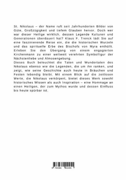 St. Nikolaus - der Name ruft seit Jahrhunderten Bilder von Güte, Großzügigkeit und tiefem Glauben hervor. Doch wer war dieser Heilige wirklich, dessen Legende Kulturen und Generationen überdauert hat? Klaus F. Trenck lädt Sie auf eine faszinierende Reise ein, die die historischen Wurzeln und das spirituelle Erbe des Bischofs von Myra enthüllt. Erleben Sie den Übergang von einem engagierten Kirchenmann zu einer weltweit verehrten Symbolfigur der Nächstenliebe und Almosengebung.Dieses Buch beleuchtet die Taten und Wundertaten des Nikolaus ebenso wie die Legenden, die um ihn ranken, und zeigt, wie seine Geschichte auch heute in Bräuchen und Festen lebendig bleibt. Mit einem Blick auf die zeitlosen Werte, die Nikolaus verkörpert, bietet dieses Werk sowohl historisches Wissen als auch Inspiration - eine Hommage an einen Heiligen, der zum Mythos wurde und dessen Einfluss bis heute spürbar ist.