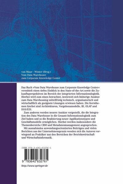 Das Buch Vom Data Warehouse zum Corporate Knowledge Center vermittelt einen tiefen Einblick in den State-of-the-Art sowie die Zukunftsperspektiven im Bereich der integrierten Informationslogistik. Hierbei wird zum einen betrachtet, inwieweit sich bisherige Ansätze zum Data Warehousing mittelfristig technisch, organisatorisch und wirtschaftlich als geeignete Lösungen erwiesen haben. Die Kernthemen hierbei sind Architekturen, Vorgehensmodelle, BI, OLAP und DSS/EIS. Zum anderen werden neuere Ansätze vorgestellt, die die Integration des Data Warehouse in die Gesamt-Informationslogistik zum Ziel haben und so die Realisierung neuer Applikationstypen und Geschäftsmodelle ermöglichen. Hierbei werden insbesondere die Themenbereiche CRM und Metadatenmanagement angesprochen.