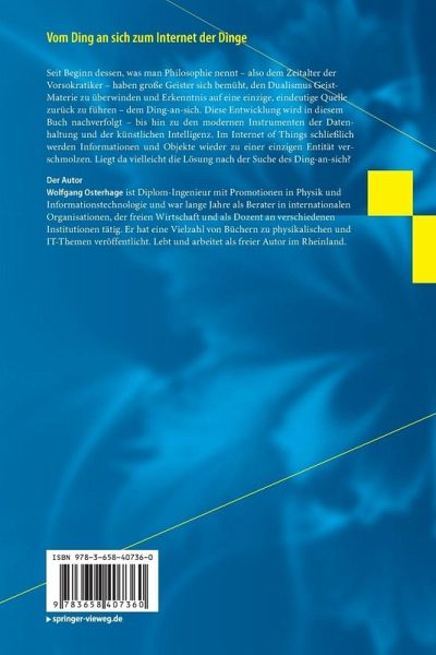 Seit Beginn dessen, was man Philosophie nennt - also dem Zeitalter der Vorsokratiker - haben große Geister sich bemüht, den Dualismus Geist-Materie zu überwinden und Erkenntnis auf eine einzige, eindeutige Quelle zurück zu führen - dem Ding-an-sich. Diese Entwicklung wird in diesem Buch nachverfolgt - bis hin zu den modernen Instrumenten der Datenhaltung und der künstlichen Intelligenz. Im Internet of Things schließlich werden Informationen und Objekte wieder zu einer einzigen Entität verschmolzen. Liegt da vielleicht die Lösung nach der Suche des Ding-an-sich?