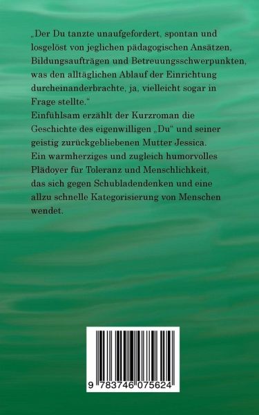 "Der Du tanzte unaufgefordert, spontan und losgelöst von jeglichen pädagogischen Ansätzen, Bildungsaufträgen und Betreuungsschwerpunkten, was den alltäglichen Ablauf der Einrichtung durcheinanderbrachte, ja vielleicht sogar in Frage stellte."Einfühlsam erzählt der Kurzroman die Geschichte des eigenwilligen "Du" und seiner geistig zurückgebliebenen Mutter Jessica. Ein warmherziges und zugleich humorvolles Plädoyer für Toleranz und Menschlichkeit, das sich gegen Schubladendenken und eine allzu schnelle Kategorisierung von Menschen wendet.